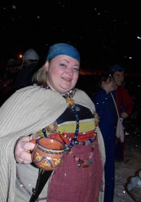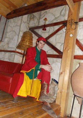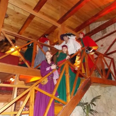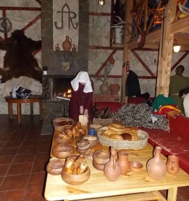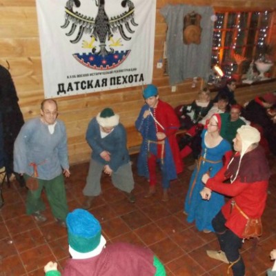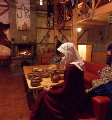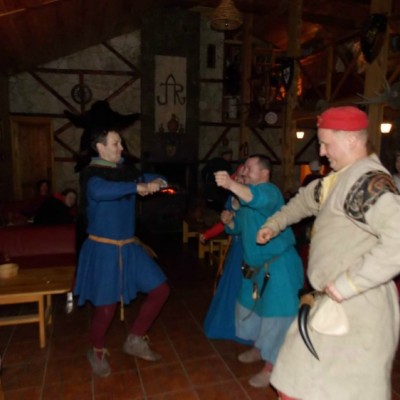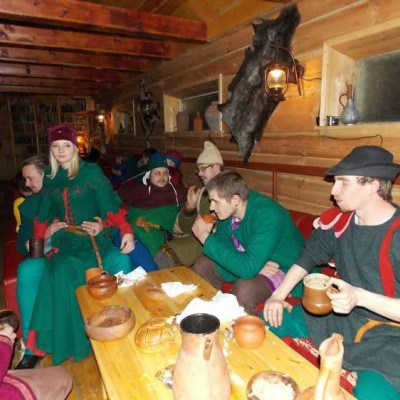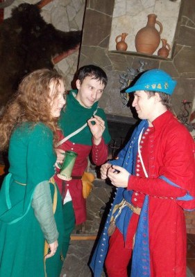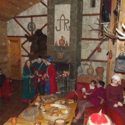 В один из Рождественских дней зал Андреевской Заставы превратился в средневековый замок. На стенах – шкуры зверей, мечи,щиты,алебарды и копья. На деревянных столах глиняная и деревянная посуда. Горит камин, звучат средневековые флейты и бубны. Все гости одеты в самотканые одежды, красные капюшоны. На женщинах длинные суконные юбки и белые чепчики.