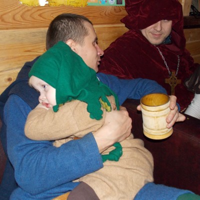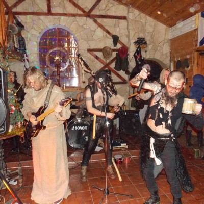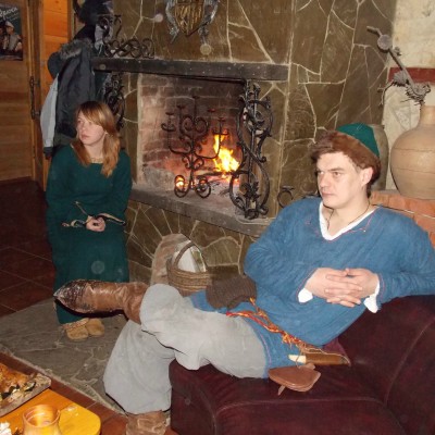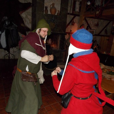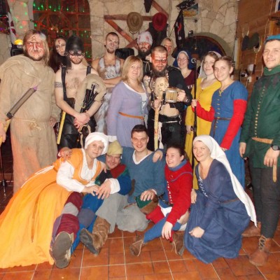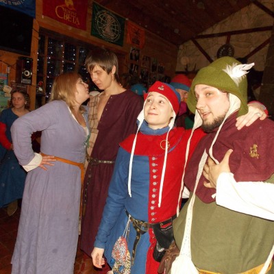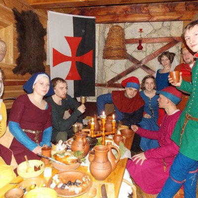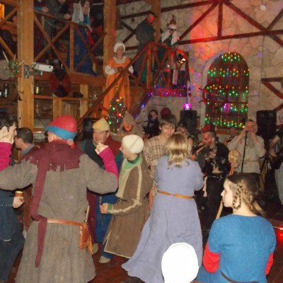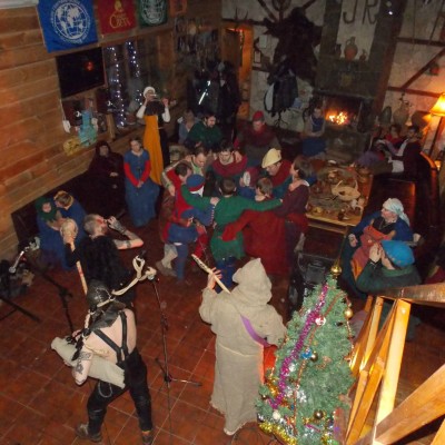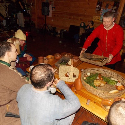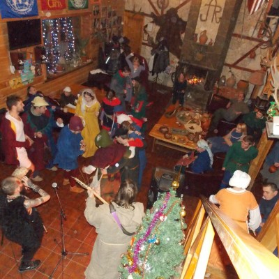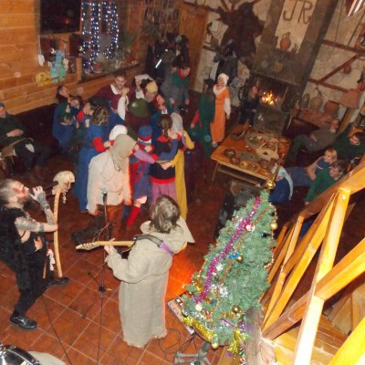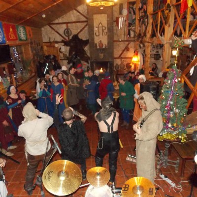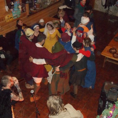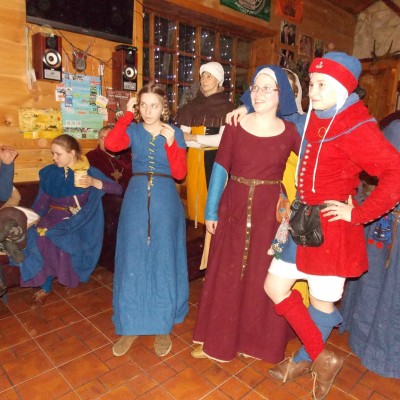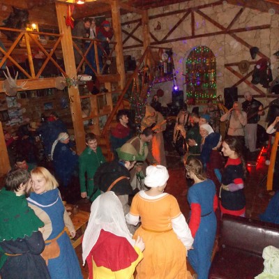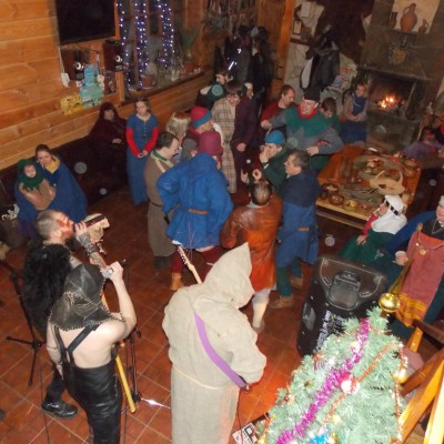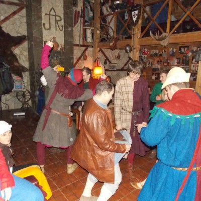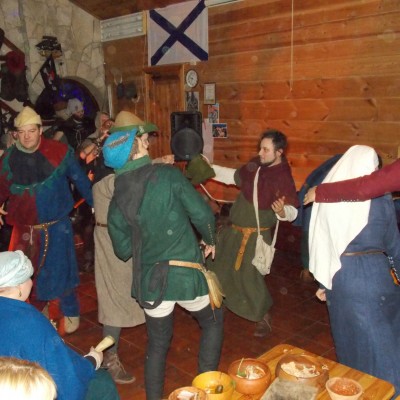 Начало нового 2016года (5-го января) традиционно было отмечено сразу несколькими рыцарскими клубами на Андреевской Заставе . Как всегда средневековые костюмы, оружие и глиняная посуда сочетались на этот раз с настоящей средневековой музыкой. Гостями вечеринки в «таверне» стали музыканты из группы «Жабъ». Настоящая волынка, флейты и барабаны задали жару и заставили всех собравшихся пуститься в пляс.